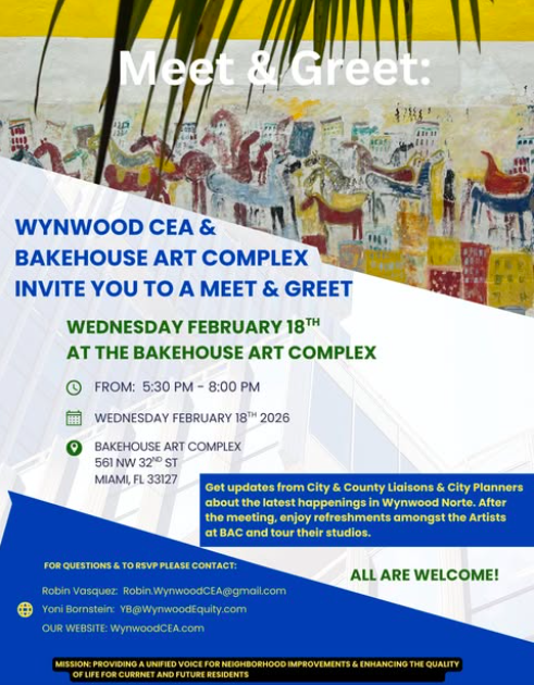 The Wynwood Community Enhancement Association (WCEA) is a grassroots, community-led nonprofit formed in 2018 by residents, business owners, property owners, and local organizations— such as the Bakehouse Art Complex and Mission San Juan Bautista— to raise a unified voice for Wynwood Norte, the often-overlooked, historic working‑class side of Wynwood.